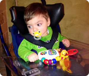 Troy’s family aspires to provide the best equipment and technology for their son to communicate, play, and function comfortably. Some specialized equipment used by Troy include: pediatric elbow immobilizers, leg immobilizers, a wheelchair fit to size, a bathing system, orthotics, a Supine Stander, and a Gait Trainer.