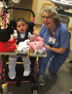 Riley’s comprehensive inpatient treatment plan included occupational therapy, speech and feeding therapies, and physical therapy. Her physical therapist, Alex, shares that they utilized aquatic therapies, functional electric stimulation, bracing, knee immobilizers, standers and gait trainers during sessions, along with therapy sessions with Facility Dog, Burton.