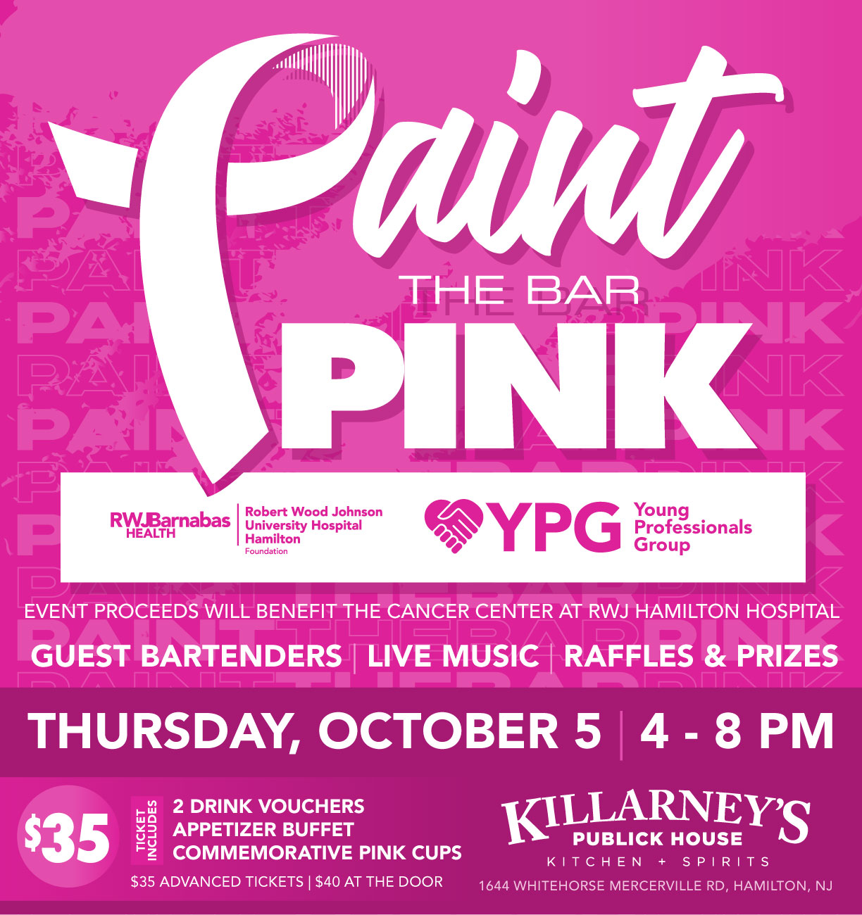 Join the YPGs of RWJUH Hamilton at their third Paint the Bar Pink! Event tickets include 2 drink vouchers, appetizers, a gift and many other fun surprises! All proceeds will benefit the Cancer Center at RWJUH Hamilton.