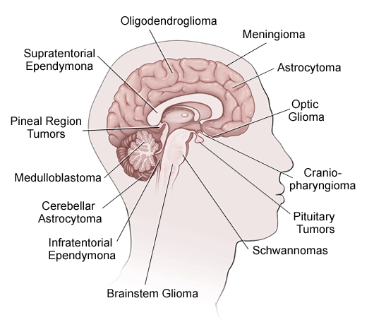The most common type of primary brain tumor is a glioma. Gliomas begin from glial cells, which are the supportive tissue of the brain. There are several types of gliomas, categorized by where they are found, and the type of cells that originated the tumor. The following are the different types of gliomas:-