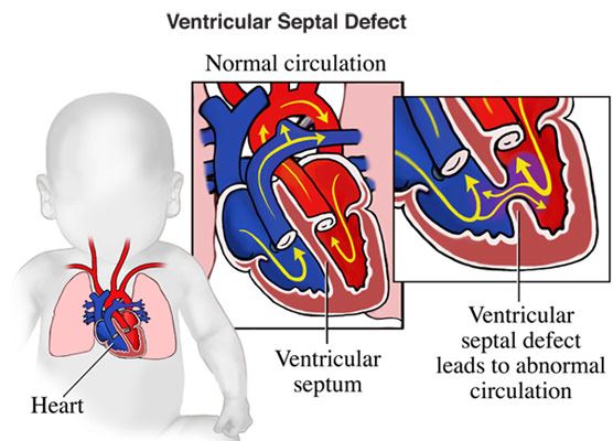 Separating the lower chambers is a muscular wall called the septum. If there is a hole or defect in the septum it is called a ventricular septal defect (VSD). VSD is a type of congenital heart defect (present at birth). In this condition, oxygenated blood from the left ventricle flows through this hole into the right ventricle (non-oxygenated blood). This mixture causes an increase in the amount of blood flowing toward the lungs. If not properly addressed, it can lead to heart failure, pulmonary hypertension or heart arrhythmias.