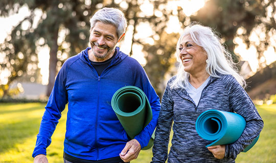 happy couple walking with yoga mats