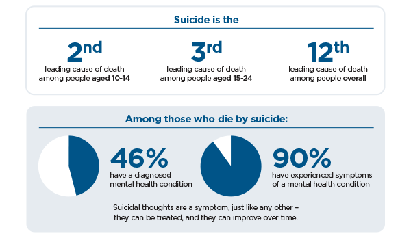 Suicide is the second leading cause of death among people aged 10 to 14. It is the third leading cause of death among people aged 15 to 24. And it is the twelfth leading cause of death among people overall.