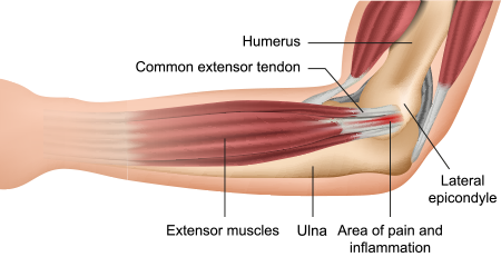 Tennis elbow arises from inflammation or micro-tears in the tendons that join the forearm muscles to the outside bony area (lateral epicondyle) of your elbow. These tendons anchor the muscles that extend the wrist and fingers. Tennis elbow is an over use injury — a result of repetitive use of the forearm muscles and tendons that connect to the bony bump on the outside of the elbow. Tennis elbow injuries can vary from mild to severe.