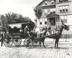 At the turn-of-the-century, a horse-drawn ambulance stands in front of